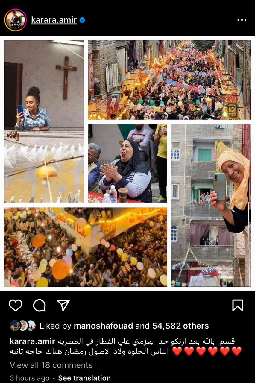 وكتب أمير كرارة من خلال حسابه الشخصي على موقع التواصل الاجتماعى "إنستجرام": "أقسم بالله بعد إذنكو حد يعزمني على الفطار في المطرية الناس الحلوة ولاد الأصول رمضان هناك حاجة تانية".