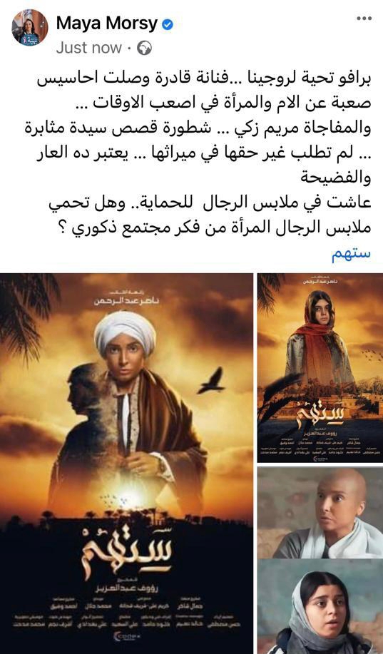 وقالت «مرسي» في منشور لها عبر حسابها الرسمي على موقع التواصل الاجتماعي فيس بوك: "برافو.. تحية لروجينا.. فنانة قادرة وصلت أحاسيس صعبة عن الأم والمرأة المصرية في أصعب الأوقات والمفاجأة مريم زكي شطورة.. قصص سيدة مثابرة لم تطلب غير حقها في ميراثها.. يعتبر ده العار والفضيحى عاشت في ملابس الرجال للحماية.. وهل تحمي ملابس الرجال المرأة من فكر مجتمع ذكوري؟".