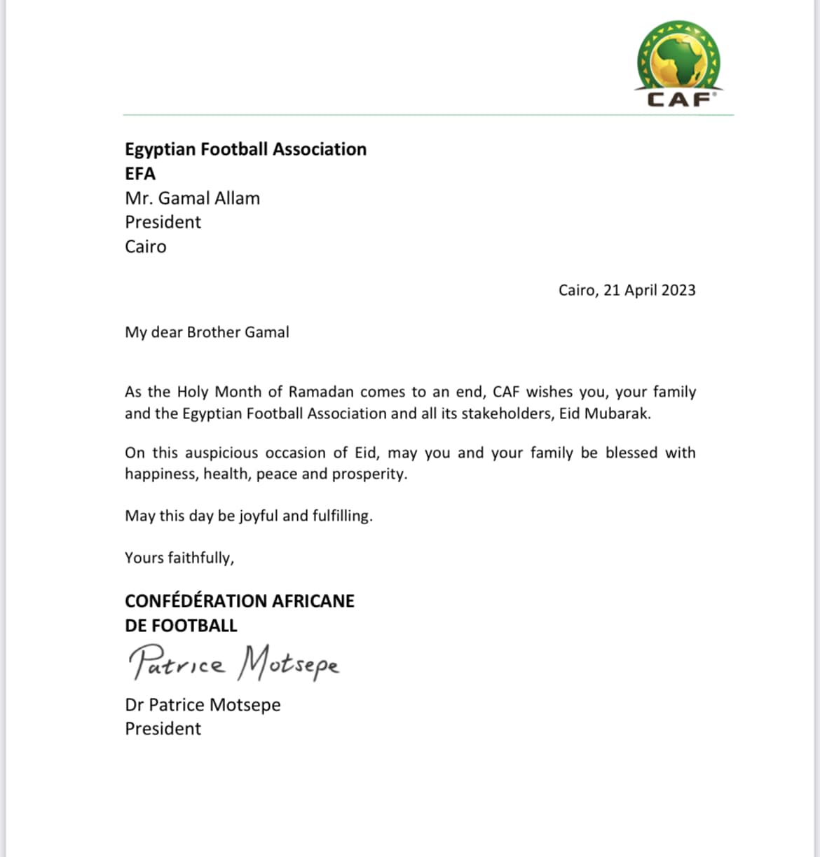 وأرسل موتسيبي خطابًا رسميًا إلى علام، تمنى خلاله عيدًا سعيدًا لرئيس الاتحاد المصري وأسرته وجميع المنتمين إلى الاتحاد.