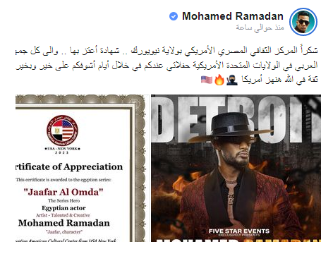 وعلق محمد رمضان قائلًا: «شكرًا المركز الثقافي المصري الأمريكي بولاية نيويورك.. شهادة أعتز بها.. وإلى كل جمهوري العربي في الولايات المتحدة الأمريكية حفلاتي عندكم في خلال أيام أشوفكم على خير وبخير.. ثقة في الله هنهز أمريكا».