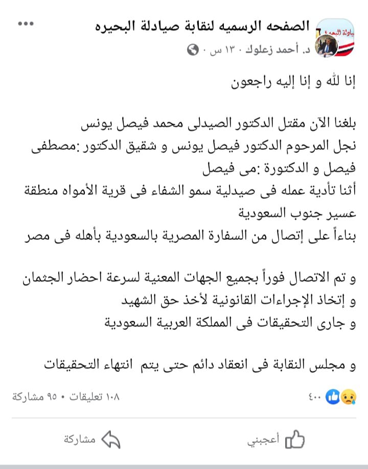 حيث لقي صيدلي مصري يدعى محمد فيصل يونس، مصرعه إثر تعرضه لحادث قتل مروع أثناء تأدية عمله بقرية الأمواه في منطقة عسير جنوب المملكة العربية السعودية، وذلك وفقًا لما نشره الدكتور أحمد زعلوك نقيب الصيادلة بالبحيرة.