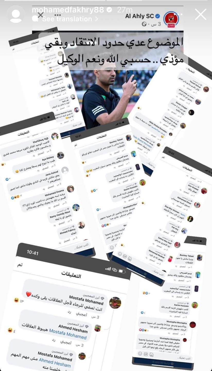 ونشر لاعب وسط الأهلي الشاب، مجموعة من تعليقات الجماهير السلبية، عبر حسابه الرسمي على موقع التواصل الاجتماعي، وعلق عليها: "الموضوع عدى حدود الانتقاد وبقى مؤذي، حسبي الله ونعم الوكيل".