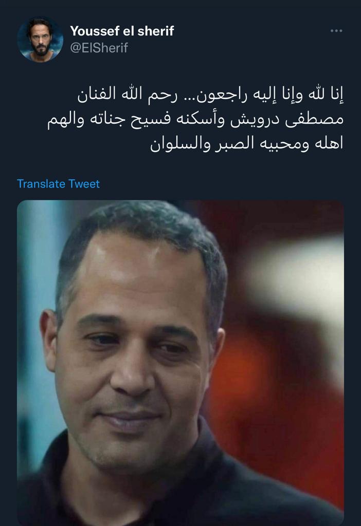 كما نعى النجم يوسف الشريف قائلا: إنا لله وإنا إليه راجعون ، رحم الله الفنان مصطفى درويش وأسكنه فسيح جناته وألهم أهله ومحبيه الصبر والسلوان.