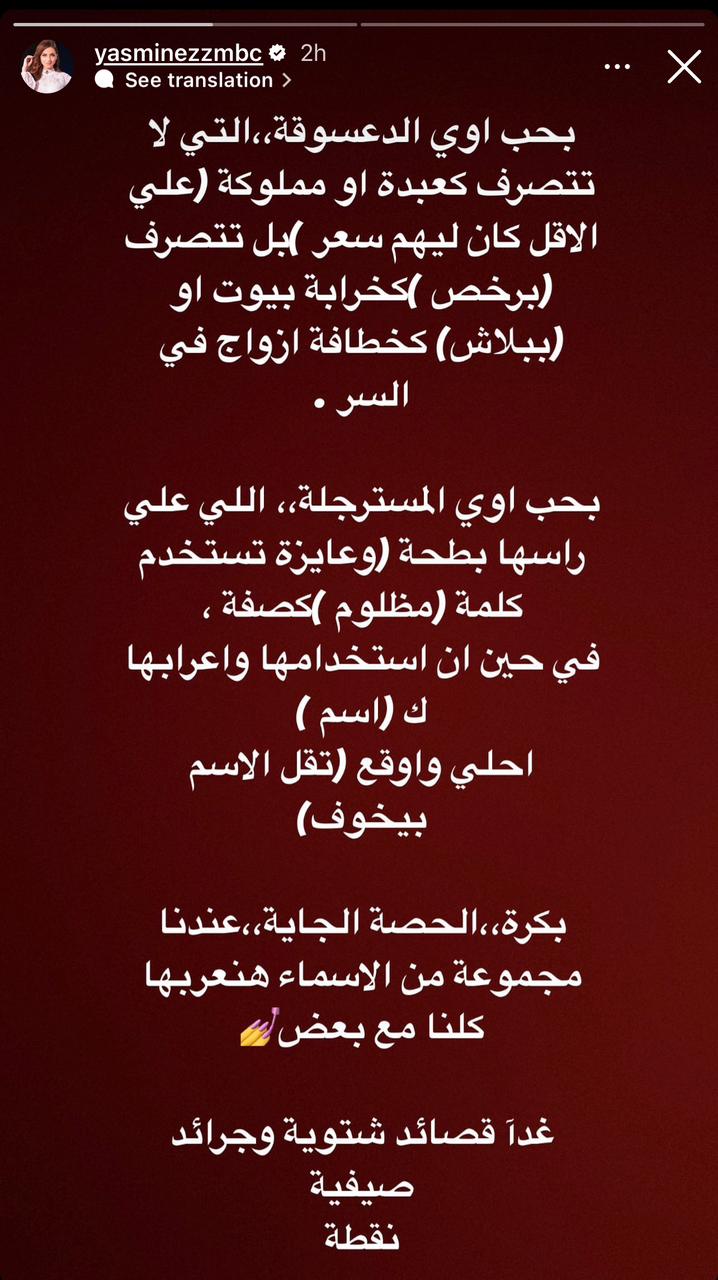 واختتمت قائلة: "بكرة الحصة الجاية، عندنا مجموعة من الأسماء هنعربها كلنا مع بعض، غدا قصائد شتوية وجرائد صيفية نقطة".