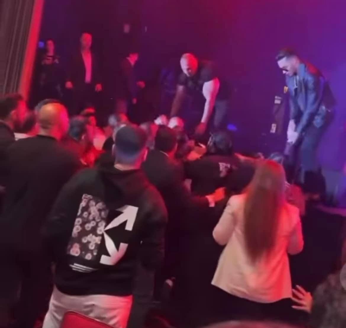 وأثناء الحفل قامت خناقة بين أفراد الأمن الخاص بالحفل وبين أحد الجماهير وصلت للتشابك بالأيدي والألفاظ الخارجة.