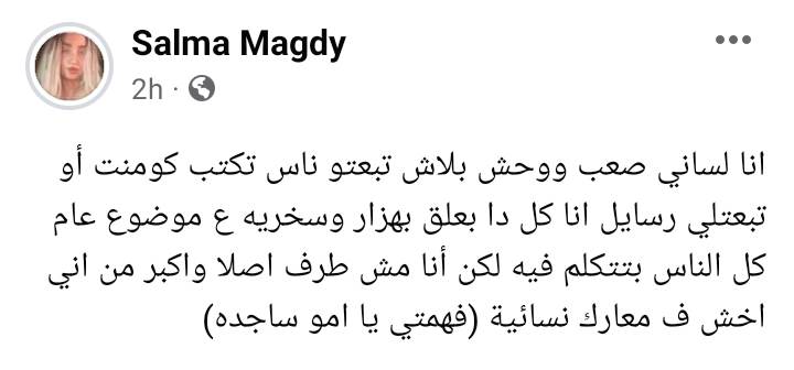 وكتبت سلمى مجدي عبر حسابها الرسمي بموقع التواصل الإجتماعي “فيسبوك”: "انا لساني صعب ووحش بلاش تبعتو ناس تكتب كومنت أو تبعتلي رسايل".