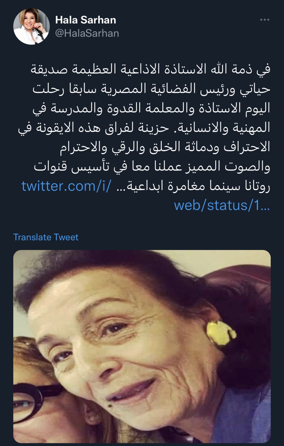 وكتبت هالة سرحان: في ذمة الله الأستاذة الإذاعية العظيمة صديقة حياتي ورئيس الفضائية المصرية سابقا، رحلت اليوم الأستاذة والمعلمة القدوة والمدرسة في المهنية والإنسانية.