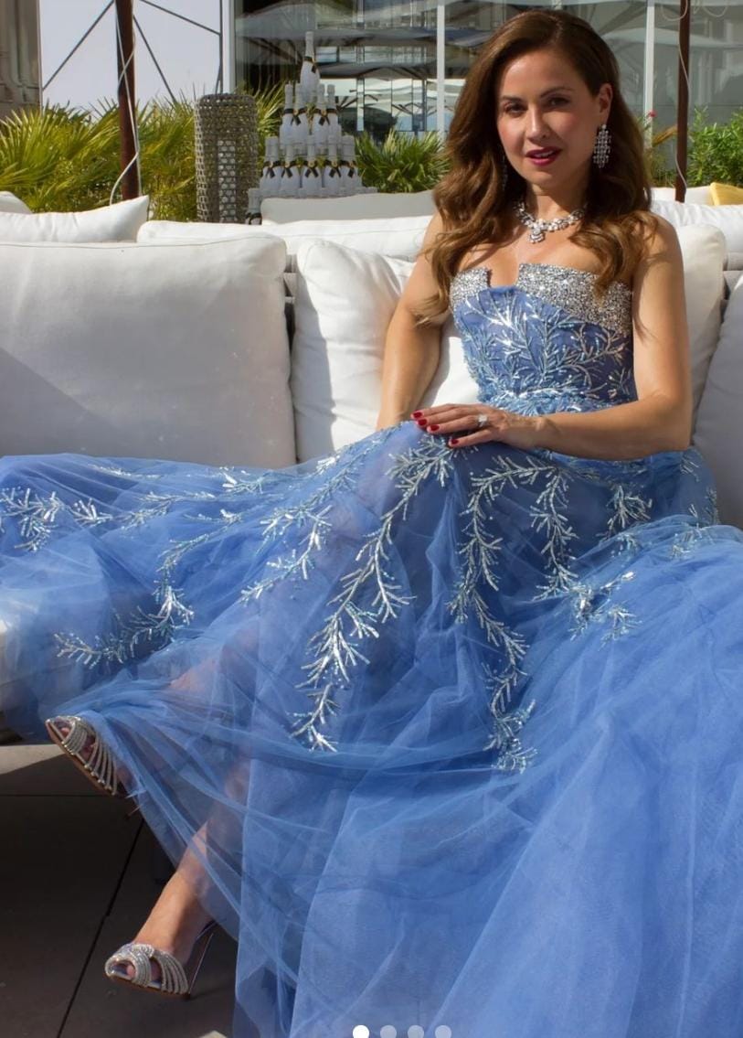 تألقت مذيعة مشاهير العالم ريا أبي راشد، بإطلالة ساحرة بفستان أزرق لامع مكشوف الصدر بذيل طويل شفاف، من تصميم المصمم الشهير جورج قبيحة.