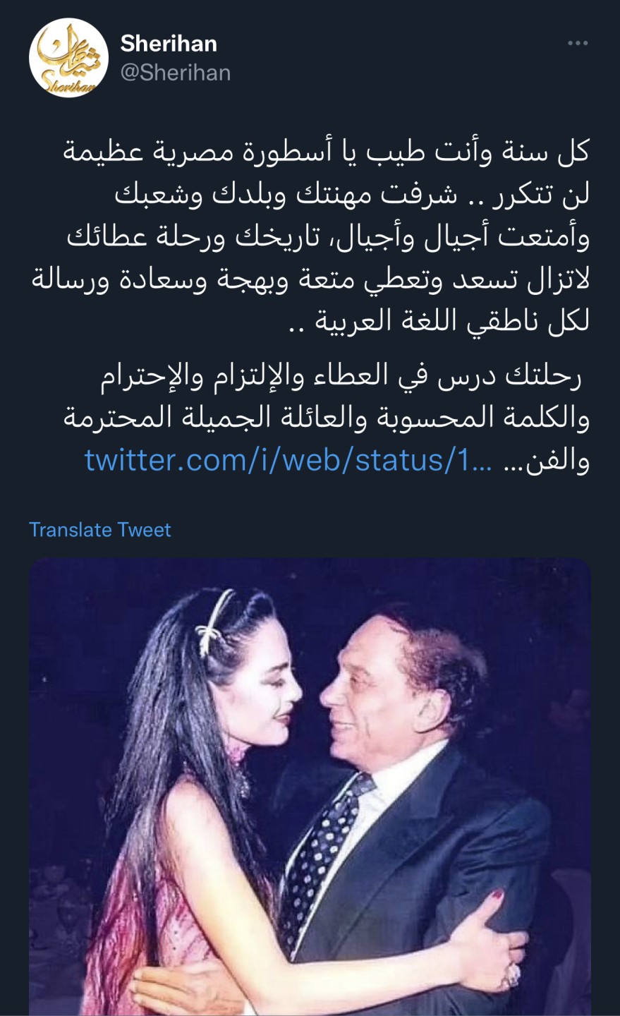 وعلقت شريهان على الصورة، قائلة: "كل سنة وأنت طيب يا أسطورة مصرية عظيمة لن تتكرر، شرفت مهنتك وبلدك وشعبك وامتعت أجيال وأجيال، تاريخك ورحلة عطائك لا تزال تسعد وتعطي متعة وبهجة وسعادة ورسالة لكل ناطقي اللغة العربية".