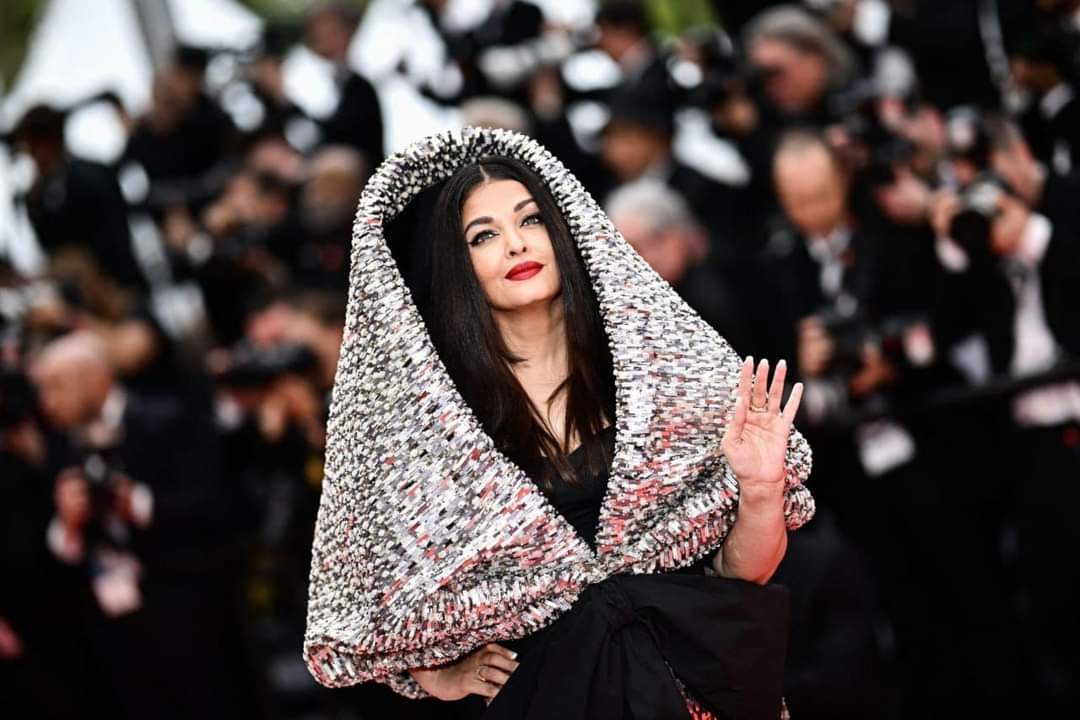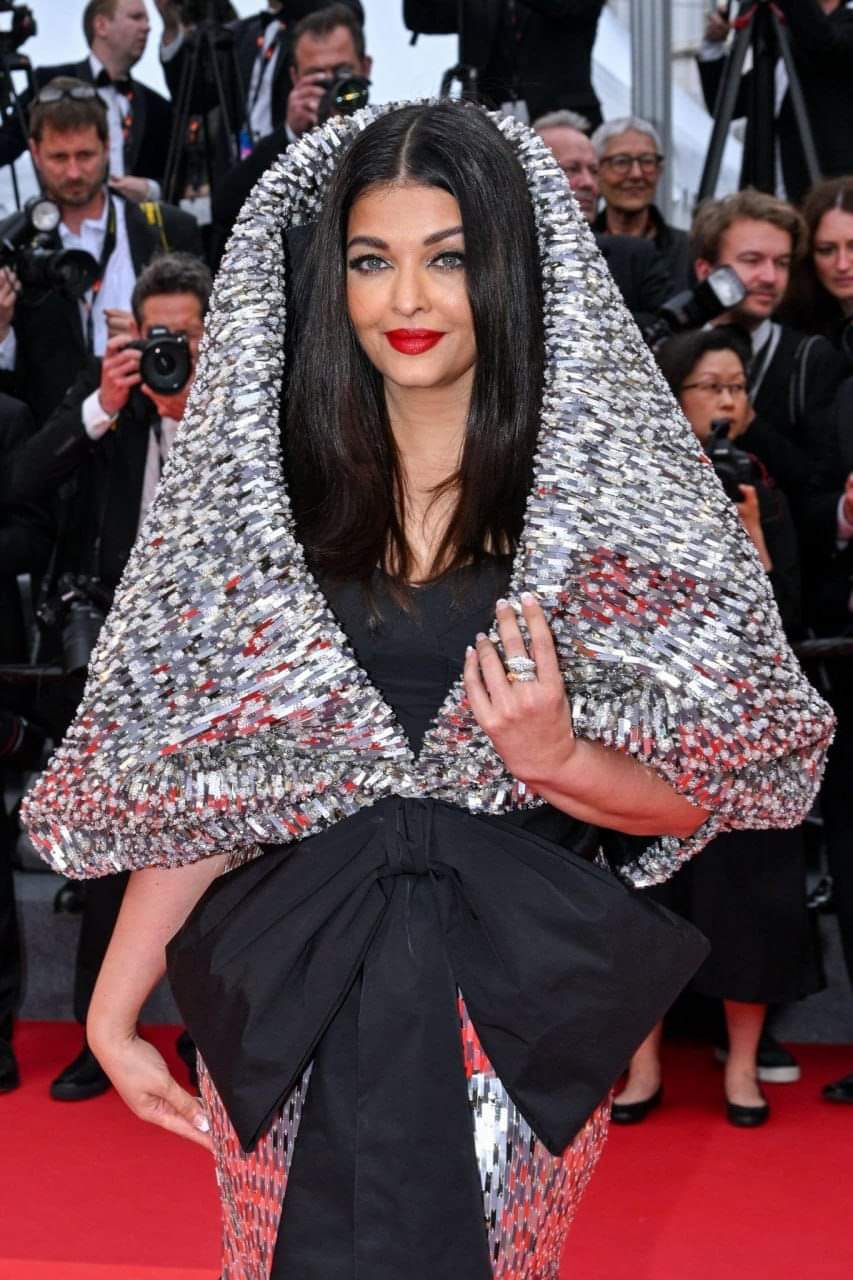 طلت إيشواريا راي بفستان طويل ممزوج باللونين الأسود والفضي، مع مكياج صارخ وأحمر شفاة جذاب وشعر منسدل، ولفتت أنظار عدسات الكاميرات العالمية منذ وصولها على السجادة الحمراء لمهرجان كان، بسبب فستانها الفضائي ووجها الجذاب.