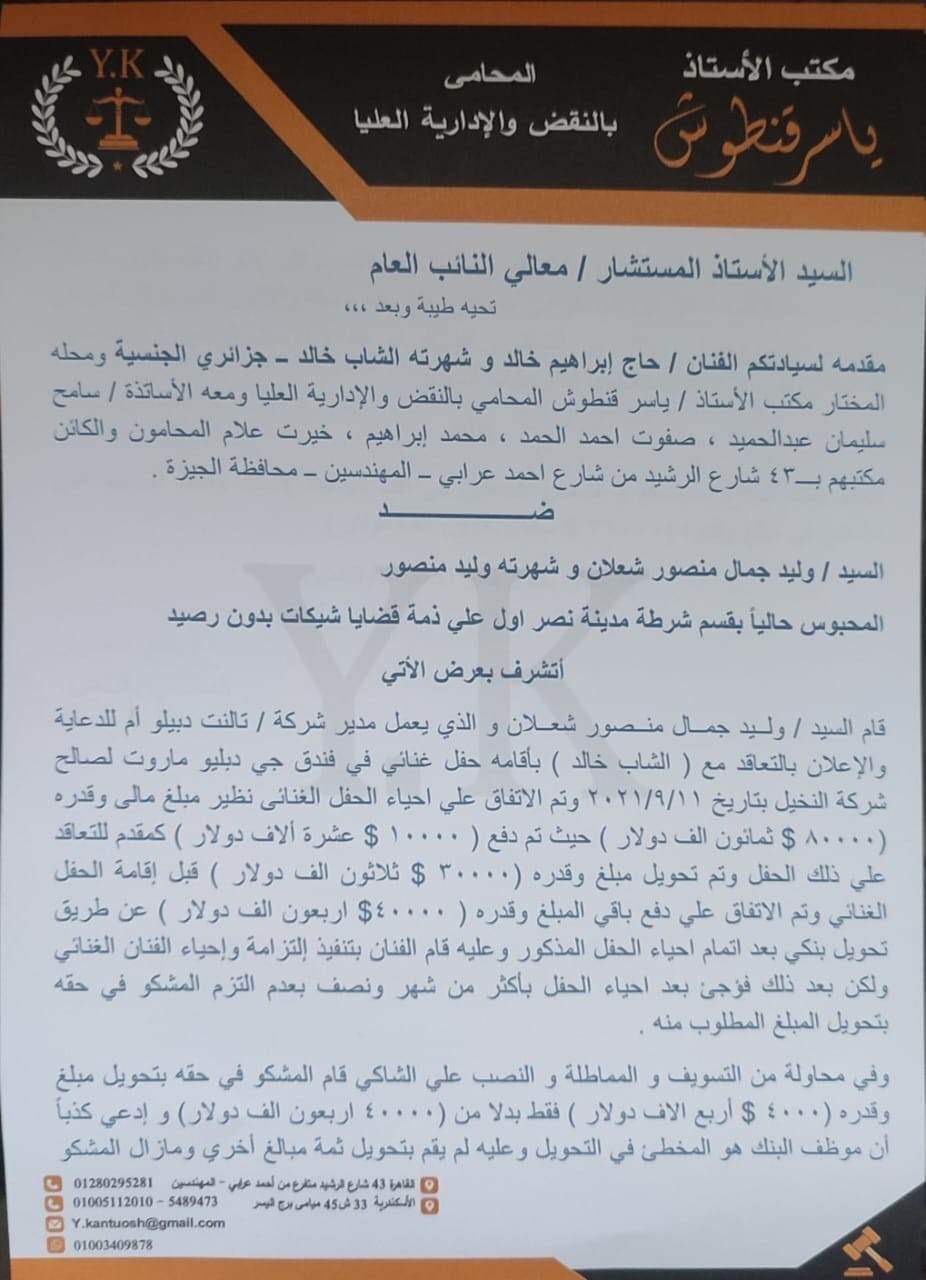 وحملت عريضة الدعوى رقم 28137 لسنة 2023، وجاء فيها أن الواقعة تعود إلى 11 سبتمبر عام 2021، حيث اتفق وليد جمال منصور شعلان، وشهرته وليد منصور مع الشاب خالد على إحياء حفل غنائي لصالح شركة النخيل بأحد الفنادق، وذلك نظير 80 ألف دولار، حيث تم دفع 10 آلاف دولار كمقدم تعاقد، كما تم دفع 30 ألف دولار قبل موعد الحفل، وتم الاتفاق على دفع باقي المبلغ "40 ألف دولار" عن طريق تحويل بنكي، وذلك بعد الحفل، ولكن فوجئ الشاب خالد بعد الحفل بشهر ونصف بعدم التزام وليد بدفع باقي مستحقاته.