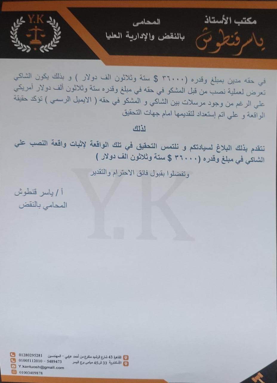 وأضاف البلاغ أنه في محاولة من التسويف والمماطلة قام وليد منصور بتحويل 4 آلاف دولار فقط، وادعى أن موظف البنك هو المخطئ، وعليه لم يتم تحويل باقي المبلغ حتى الآن وهو 36 ألف دولار.