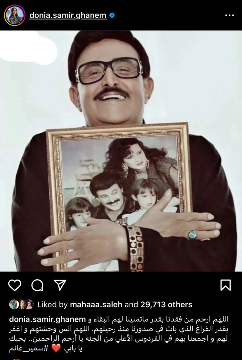 وعلقت دنيا سمير غانم على الصورة قائلة: اللهم ارحم من فقدنا بقدر ماتمنينا لهم البقاء وبقدر الفراغ الذي بات في صدورنا منذ رحليهم، اللهم آنس وحشتهم واغفر لهم واجمعنا بهم في الفردوس الأعلى من الجنة ياأرحم الراحيم، بحبك يا بابي.