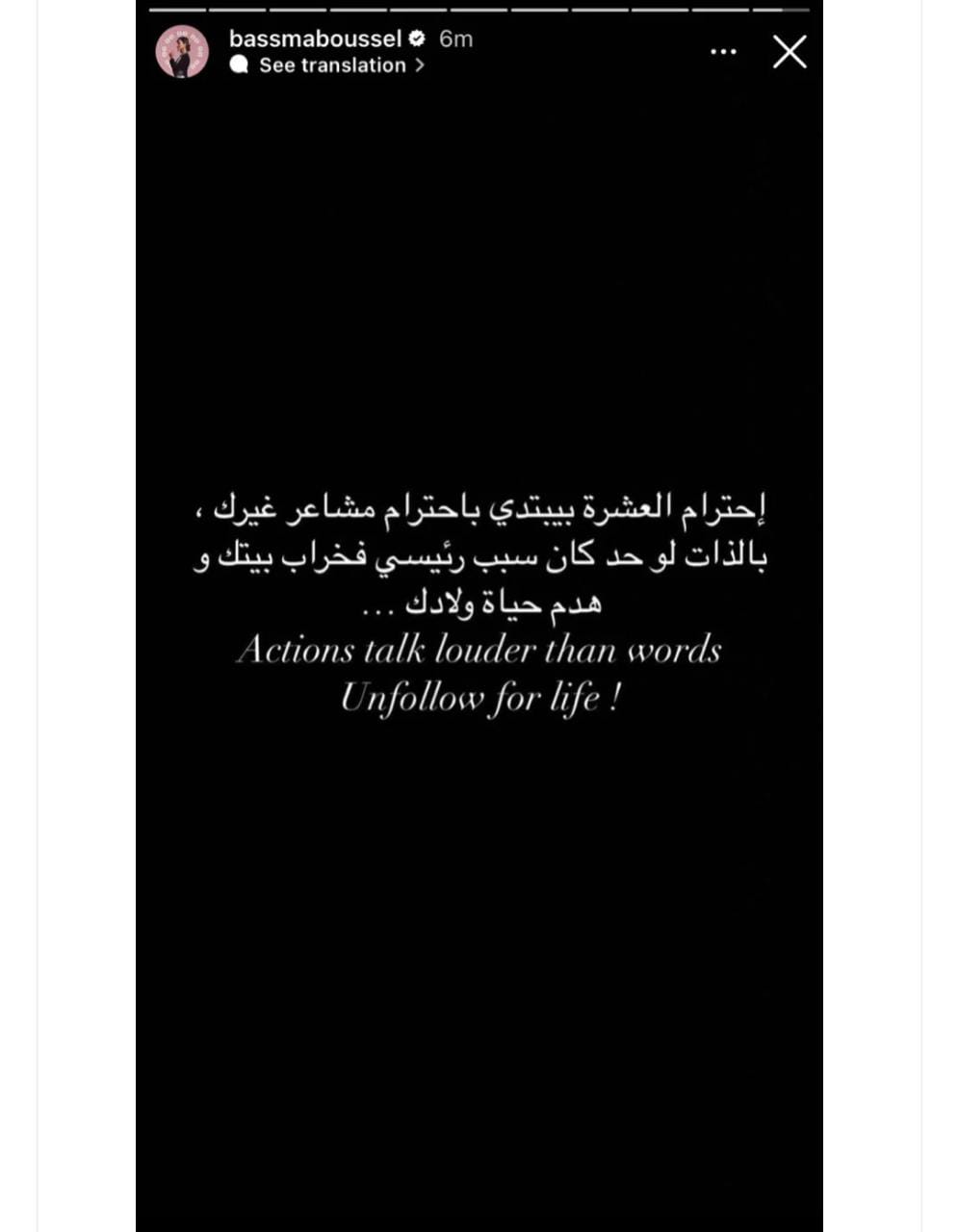 وكتبت عبر استوري آخر على موقع تبادل الصور والفيديوهات إنستجرام: كانت سببا في خراب البيت.. احترام العشرة بيبتدي باحترام مشاعر غيرك.. بالذات لو حد كان سبب رئيسي في خراب بيتك وهدم حياة ولادك.