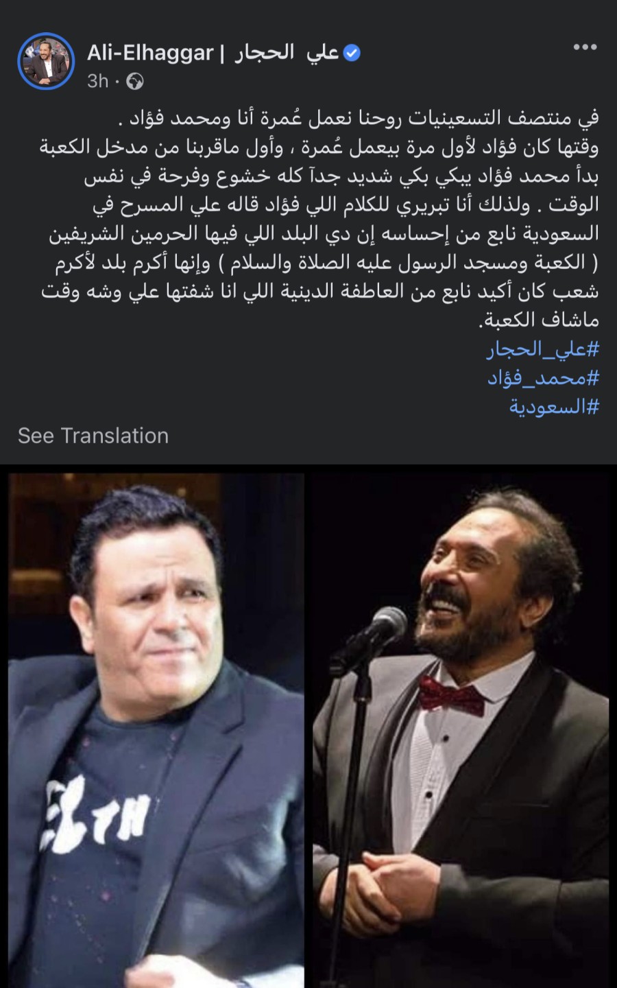 كتب علي الحجار، من خلال حسابه الرسمي على موقع التواصل الاجتماعى "فيسبوك": "في منتصف التسعينيات روحنا نعمل عمرة أنا ومحمد فؤاد، وقتها كان فؤاد لأول مرة بيعمل عمرة، وأول ماقربنا من مدخل الكعبة بدأ محمد فؤاد يبكي بكي شديد جدا كله خشوع وفرحة في نفس الوقت".