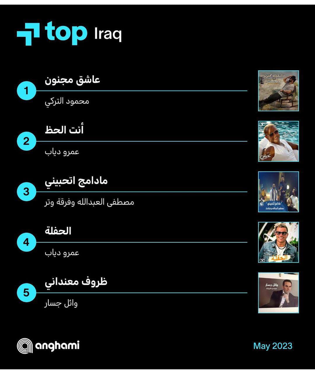 بالااتقال إلى العراق، تصدر محمود التركي ، بأغنية عاشق مجنون، المركز الأول فالاستماعات، فيما احتلت أغنية أنت الحظ، للهضبة عمرو دياب المركز الثاني، وجاءت أغنية مادامچ اتحبيني لمصطفي العبد الله وفرقة وتر المركز الثالث.