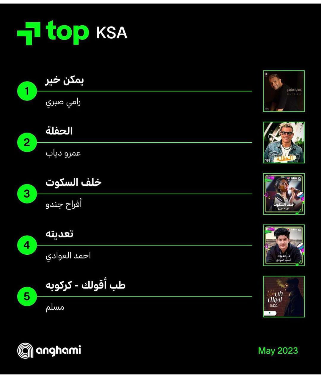 نشرت أنغامي عبر صفحات التواصل الاجتماعي الخاصة بالتطبيق، الأغاني التى تصدرت الاستماعات فى معظم الدول العربية لشهر مايو فى كلا من مصر، السعودية، العراق، الجزائر، المغرب، وتونس.