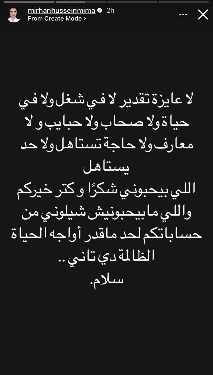 وتابعت ميرهان، قائلة: "لا عايزة تقدير لا في شغل ولا في حياة ولا صحاب ولا حبايب ولا معارف ولا حاجة تستاهل، ولا حد يستاهل اللي بيحبوني شكرًا وكتر خيركم واللي مابيحبونيش شيلوني من حساباتكم لحد ماقدر أواجه الحياة الظالمة دي تاني سلام".