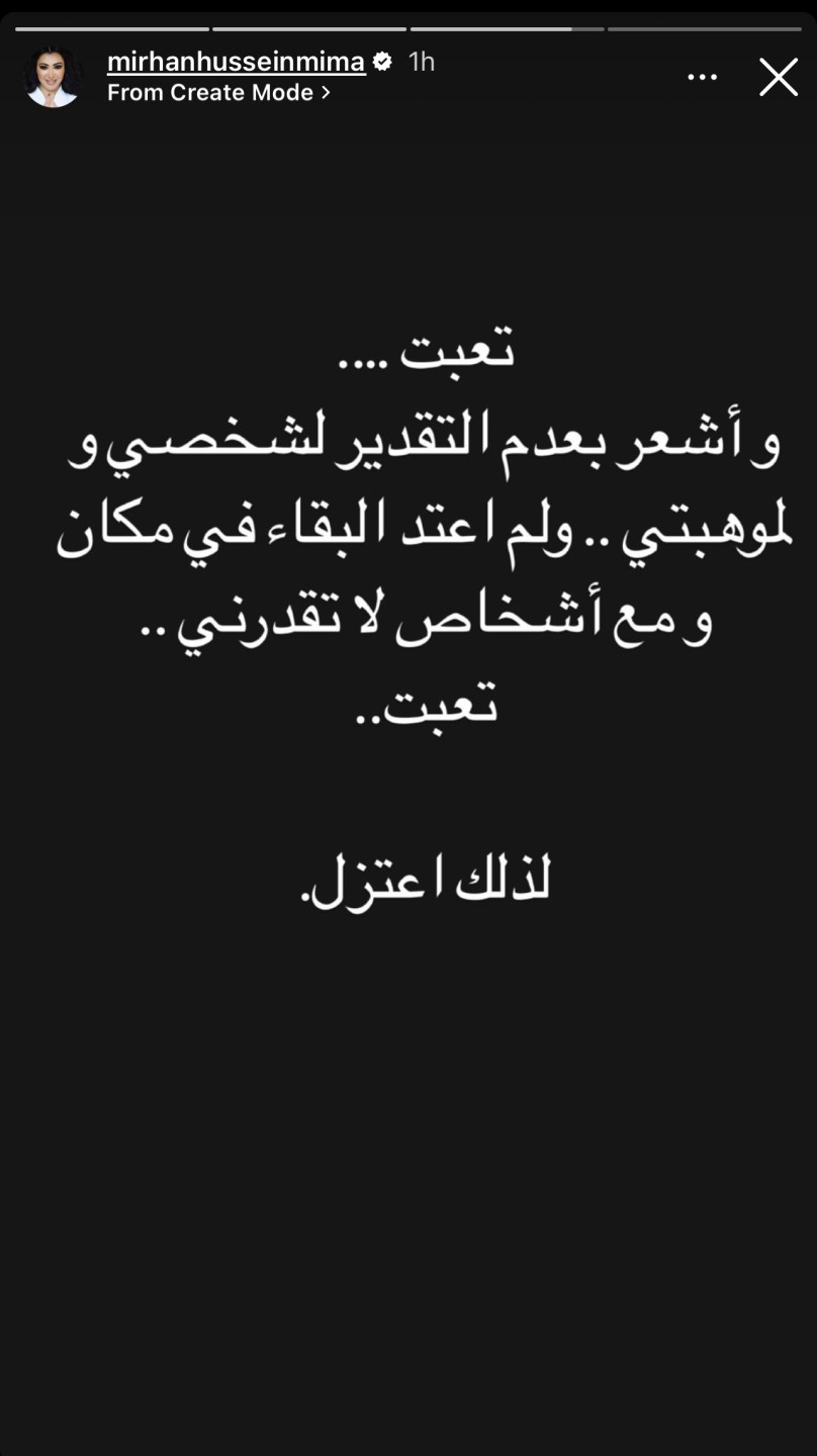وختمت قائلة: تعبت وأشعر بعدم التقدير لشخصي ولموهبتي ولم اعتد البقاء في مكان ومع أشخاص لا تقدرني تعبت لذلك اعتزل.
