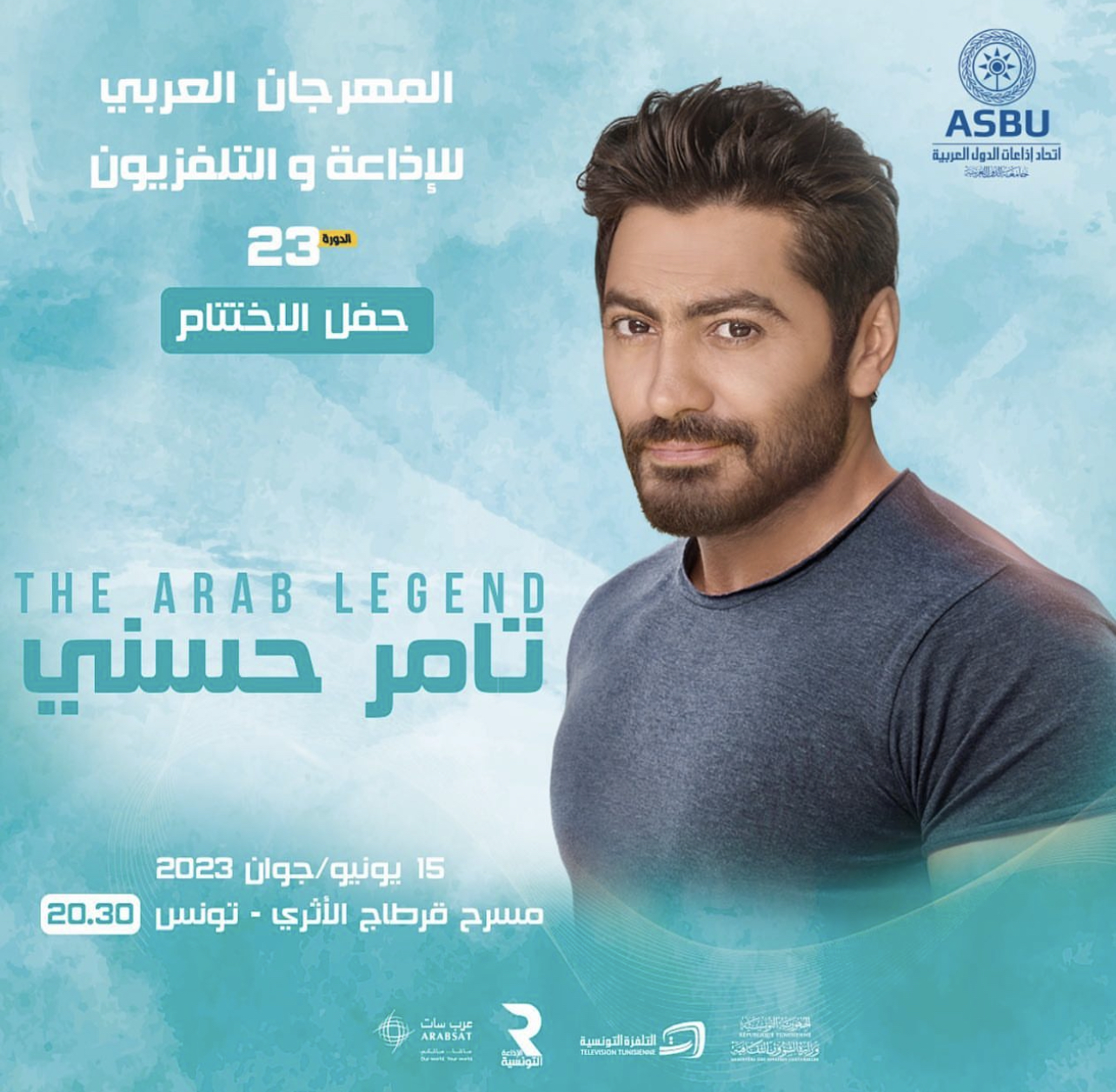 يستعد النجم تامر حسني، لإحياء حفل ختام المهرجان العربي للإذاعة والتلفزيون، والذي سيقام يوم 15 يونيه، على مسرح قرطاج الأثري في تونس.