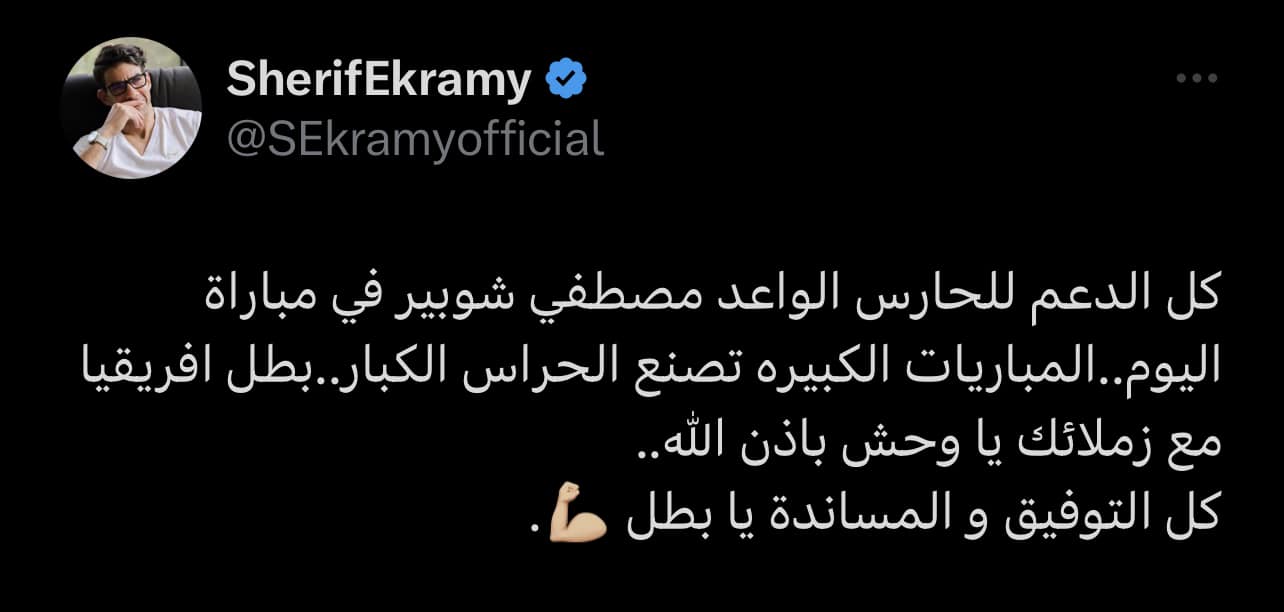 وكتب إكرامي عبر حسابه الرسمي على موقع التدوينات القصيرة "تويتر": "الدعم للحارس الواعد مصطفى شوبير في مباراة اليوم".
