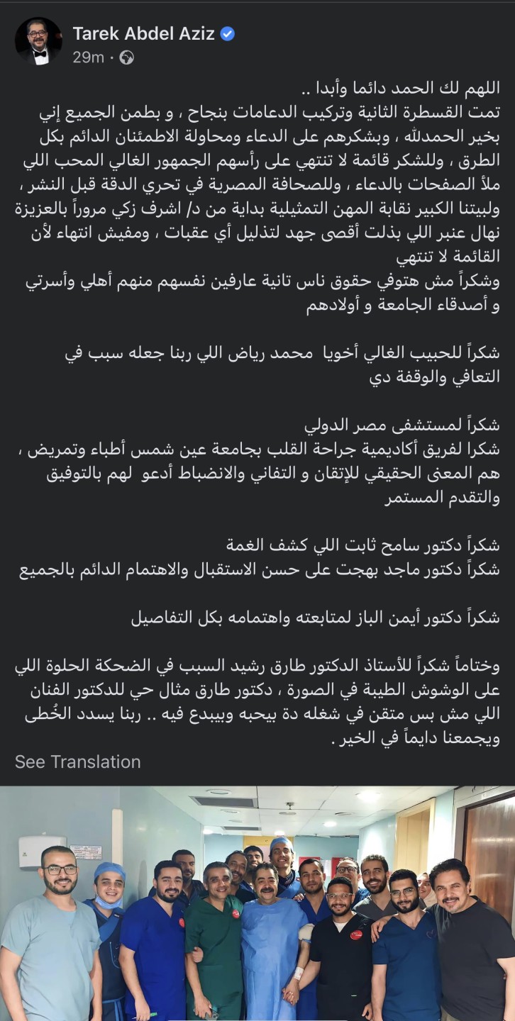 وعلق طارق عبد العزيز، على الصورة قائلا: "اللهم لك الحمد دائما وأبدا، تمت القسطرة الثانية وتركيب الدعامات بنجاح، وبطمن الجميع إني بخير الحمدلله ، وبشكرهم على الدعاء ومحاولة الاطمئنان الدائم بكل الطرق".