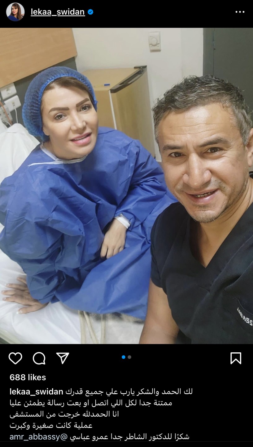 ونشرت لقاء سويدان، من خلال حسابها الشخصى على موقع التواصل الاجتماعى "إنستجرام"، صورة لها بعد إجراء العملية لتطمئن جمهورها.