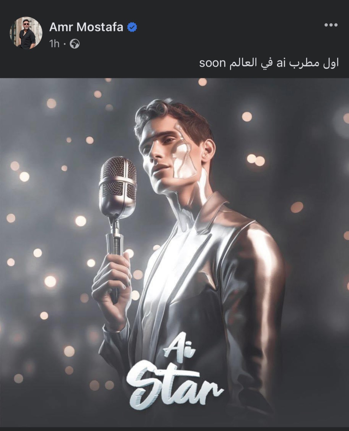 نشر منذ قليل الفنان عمرو مصطفى، بوستر دعائيا لأول مطرب بتقنية الذكاء الاصطناعى، وذلك من خلال حسابه الشخصى على موقع التواصل الاجتماعي فيسبوك.