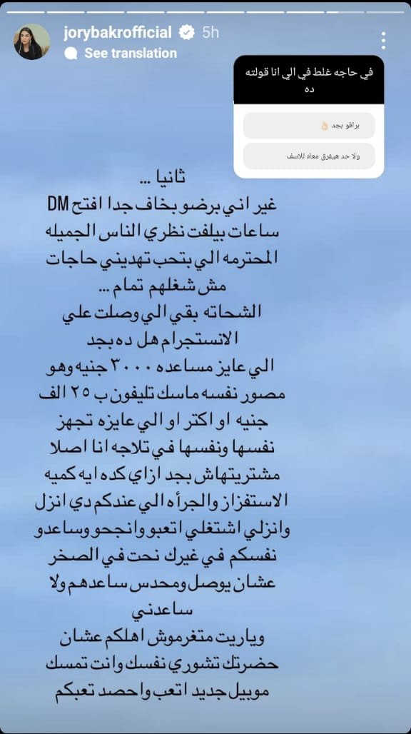 وتابعت جوري: الشحاتة بقي اللي وصلت على الإنستجرام هل ده بجد اللي عايز مساعدة 3000 جنيه، وهو مصور نفسه ماسك تليفون بـ 25 ألف جنيه أو أكتر، واللي عايزة تجهز نفسها ونفسها في ثلاجة وأنا أصلًا مشتريتهاش بجد إزاي كده إيه كمية الاستفزاز والجرأة اللي عندكم دي انزل وانزلي اشتغلي اتعبوا وانجحوا وساعدوا نفسكم في غيرك نحت في الصخر، عشان يوصل ومحدش ساعدهم ولا ساعدني.