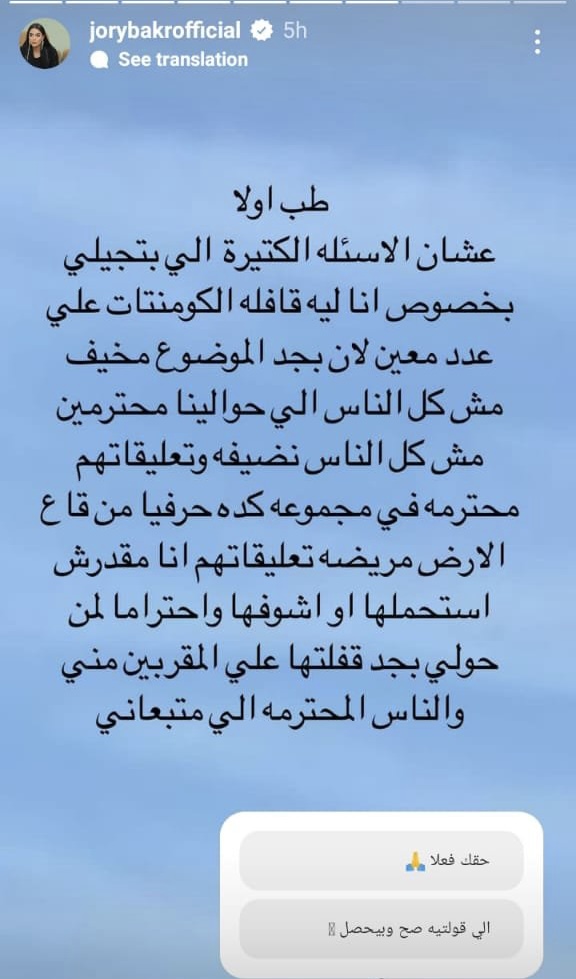 كتبت جورى: أولًا عشان الأسئلة الكثيرة اللي بتجيلي بخصوص أنا ليه قافلة الكومنتات على عدد معين لأن بجد الموضوع مخيف مش كل الناس اللي حوالينا محترمين، مش كل الناس نضيفة وتعليقاتهم محترمة في مجموعة كدة حرفيًا من قاع الأرض مريضة وتعليقاتهم أنا مقدرش استحملها أو أشوفها واحترامًا لمن حولي بجد قفلتها على المقربين مني والناس المحترمة اللي متبعاني.