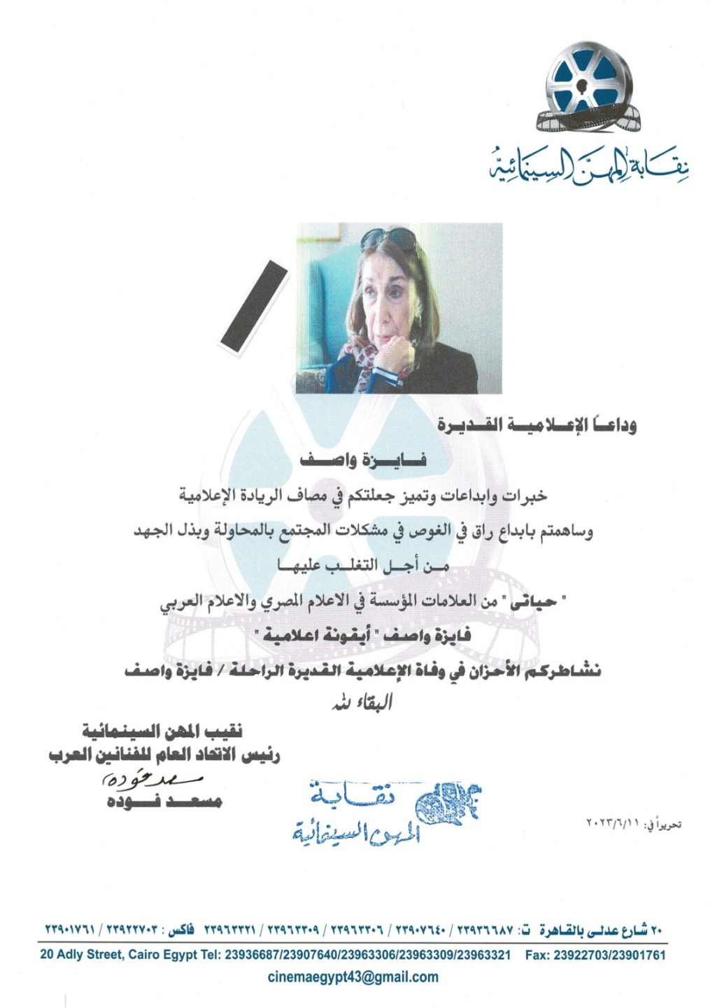نعت نقابة المهن السينمائية، برئاسة مسعد فودة، الإعلامية القديرة فايزة واصف، والتي رحلت عن عالمنا مساء أمس، بعد مسيرة حافلة من العطاء الإعلامي.