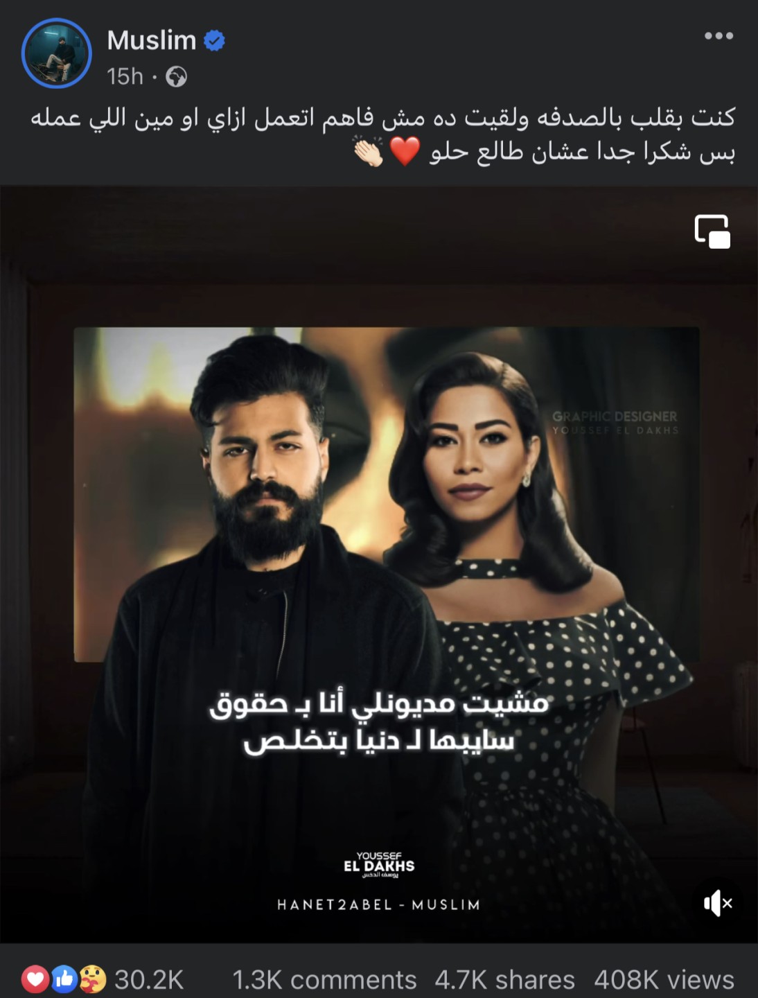 نشر الفنان مسلم، من خلال صفحته الرسمية على موقع التواصل الاجتماعي "فيسبوك" فيديو يجمعه بالنجمة شيرين على طريقة الذكاء الاصطناعي.