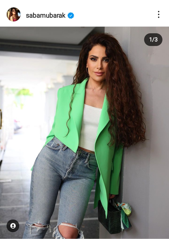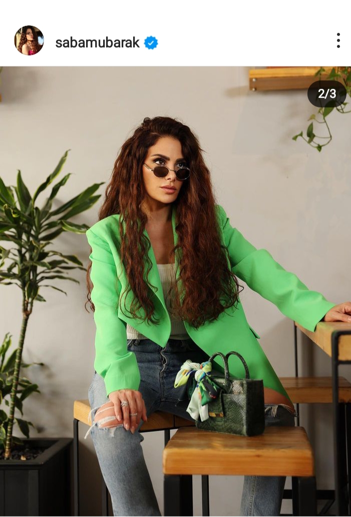 وظهرت صبا في الصور، مرتدية توب باللون الأبيض ونسقت معه بليزر باللون الأخضر، وبنطال جينز، وتركت خصلات شعرها منسدلا على كتفها.