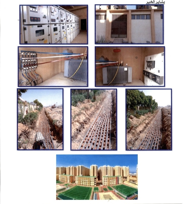 وقامت الشركة بتنفيذ التغذية الكهربية اللازمة لمشـروعات بشاير الخير (1 , 2 , 3 , 5) بإجمالي تكلفة تقديرية 362 مليون جنيه، وجاري حالياً الانتهاء من تنفيذ التغذية الكهربية للمرحلة الثانية من مشـروع بشاير الخير 5 - كما تم الانتهاء من أعمال التغذية الكهربية اللازمة للأعمال الإنشائية في مشروع (مشارف الخير) والتي تبلغ التكلفة التقديرية له 2,1 مليار جنيه.