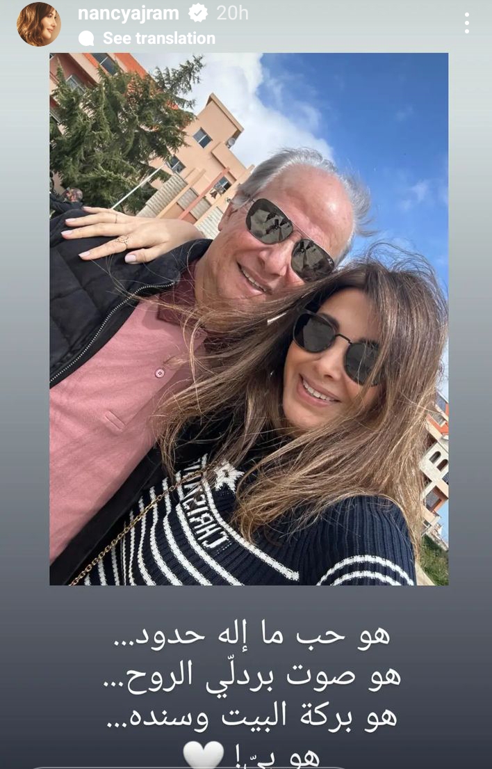 وظهرت نانسي في الصورة مع والدها، معلقة: «هو حب ما إله حدود، هو صوت بردلي الروح، هو بركة البيت وسنده، هو بي».