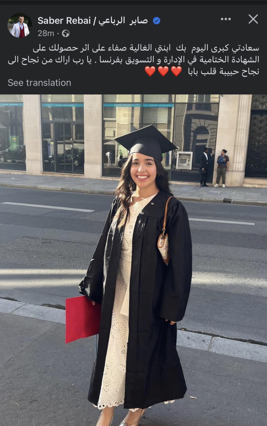 احتفل النجم الكبير صابر الرباعي، بتخرج ابنته الكبرى صفاء، وحصولها على الشهادة الختامية من فرنسا.