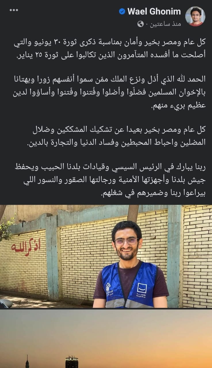 وكتب غنيم عبر حسابه على فيسبوك: "‏كل عام ومصر بخير وأمان بمناسبة ذكرى ثورة 30 يونيو والتي أصلحت ما أفسده المتآمرون الذين تكالبوا على ثورة 25 يناير".