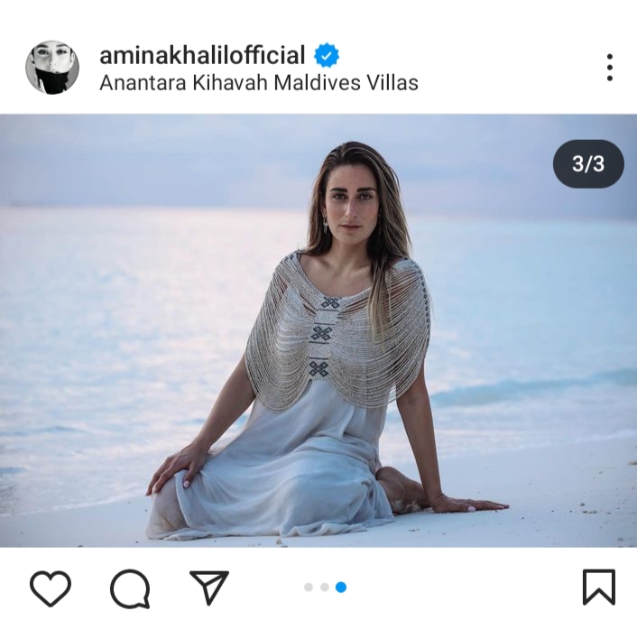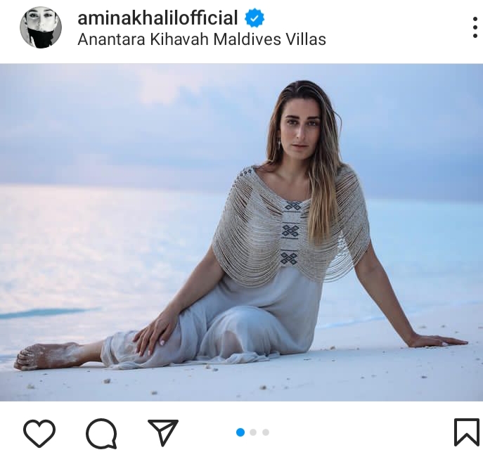 نشرت الفنانة أمينة خليل على صفحتها الشخصية بموقع تبادل الصور والفيديوهات إنستجرام، صورا جديدة من رحلتها للمالديف.
