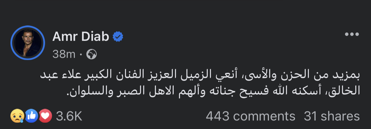 نعى النجم الكبير عمرو دياب، الفنان الكبير علاء عبد الخالق، من خلال حسابه الشخصى على موقع التواصل الإجتماعى فيسبوك، "بمزيد من الحزن والأسى، أنعي الزميل العزيز الفنان الكبير علاء عبد الخالق، أسكنه الله فسيح جناته وألهم الاهل الصبر والسلوان".
