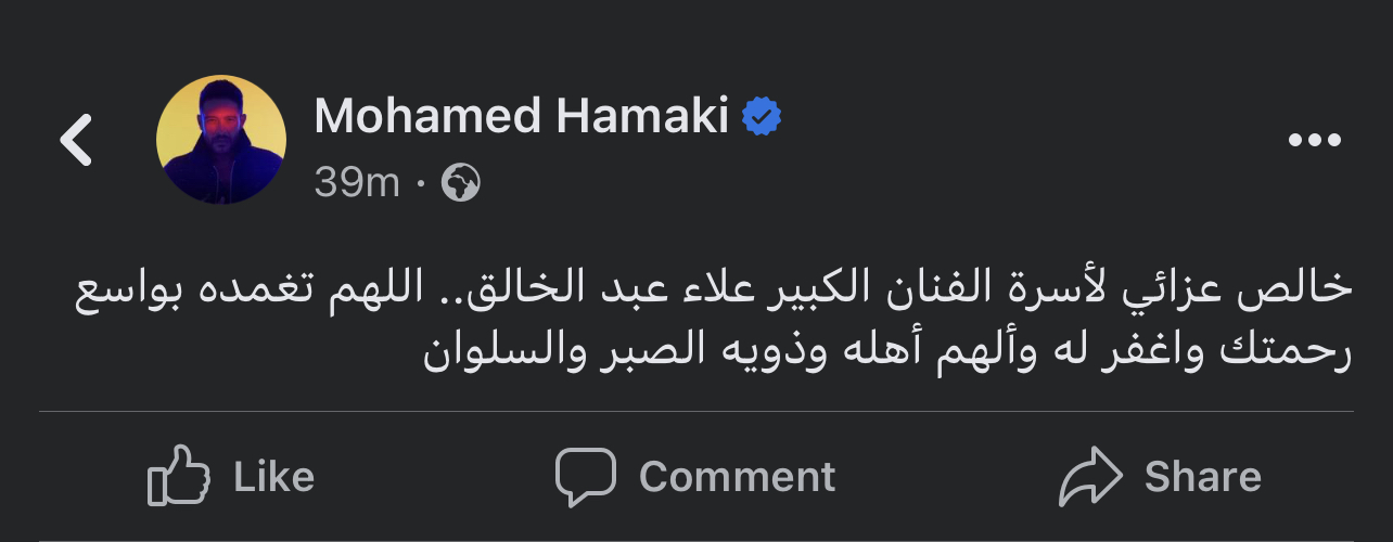 وكتب حماقى، من خلال حسابه الشخصى على موقع التواصل الإجتماعى فيسبوك: "خالص عزائي لأسرة الفنان الكبير علاء عبد الخالق، اللهم تغمده بواسع رحمتك واغفر له وألهم أهله وذويه الصبر والسلوان".