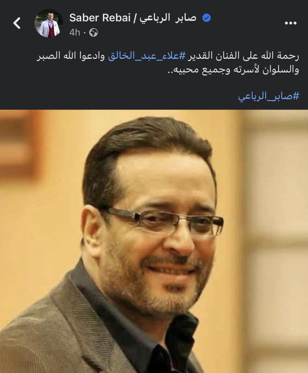 كما نعى النجم صابر الرباعى، قائلا: "رحمة الله على الفنان القدير علاء عبد الخالق، وادعوا الله الصبر والسلوان لأسرته وجميع محبيه".