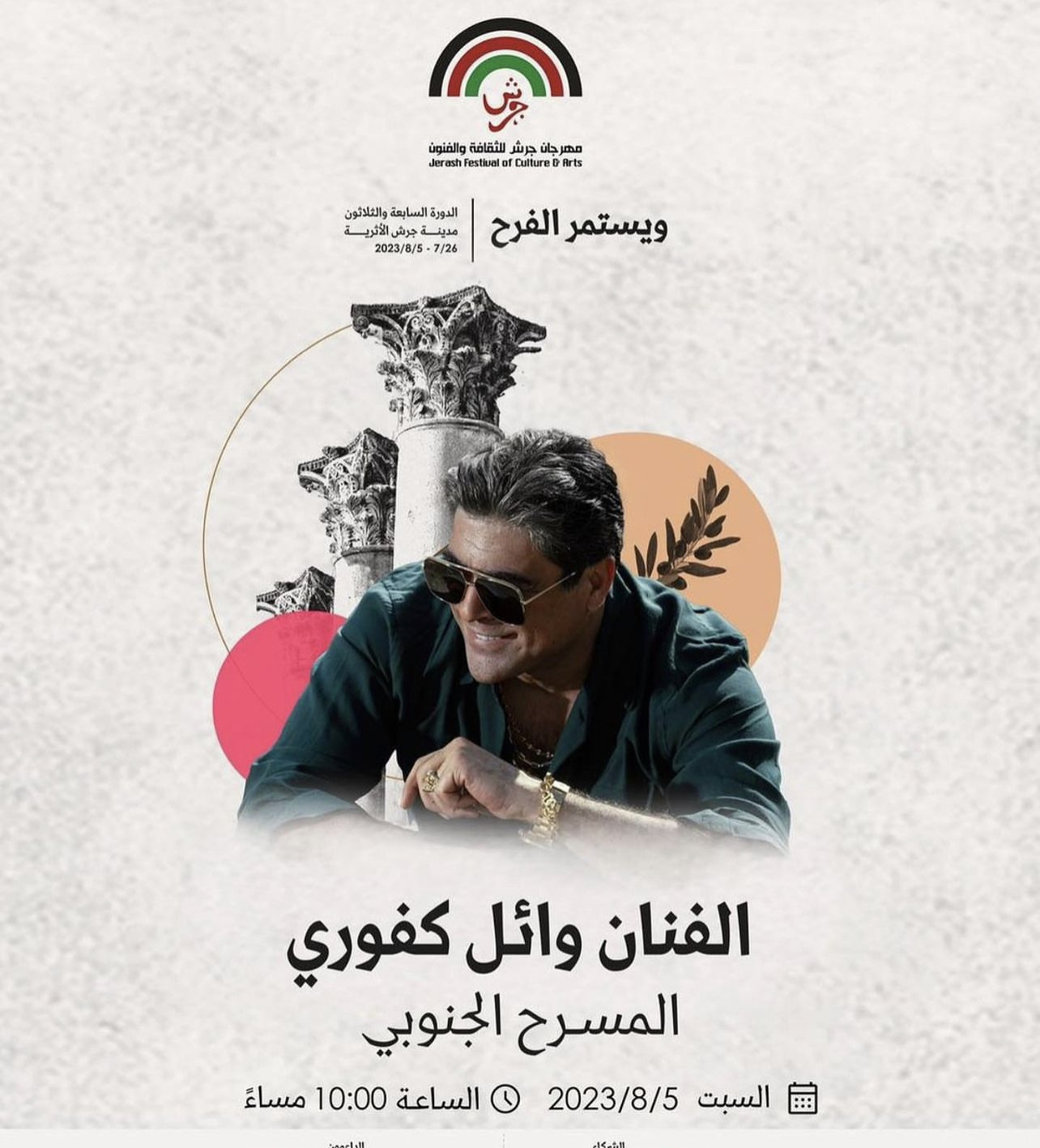 يستعد النجم اللبناني وائل كفوري، لإحياء حفل غنائي كبير، ضمن فعاليات مهرجان جرش للثقافة والفنون، وذلك يوم السبت الموافق ٥ أغسطس، على المسرح الجنوبي فى تمام الساعة العاشرة، برفقة فرقته الموسيقية.