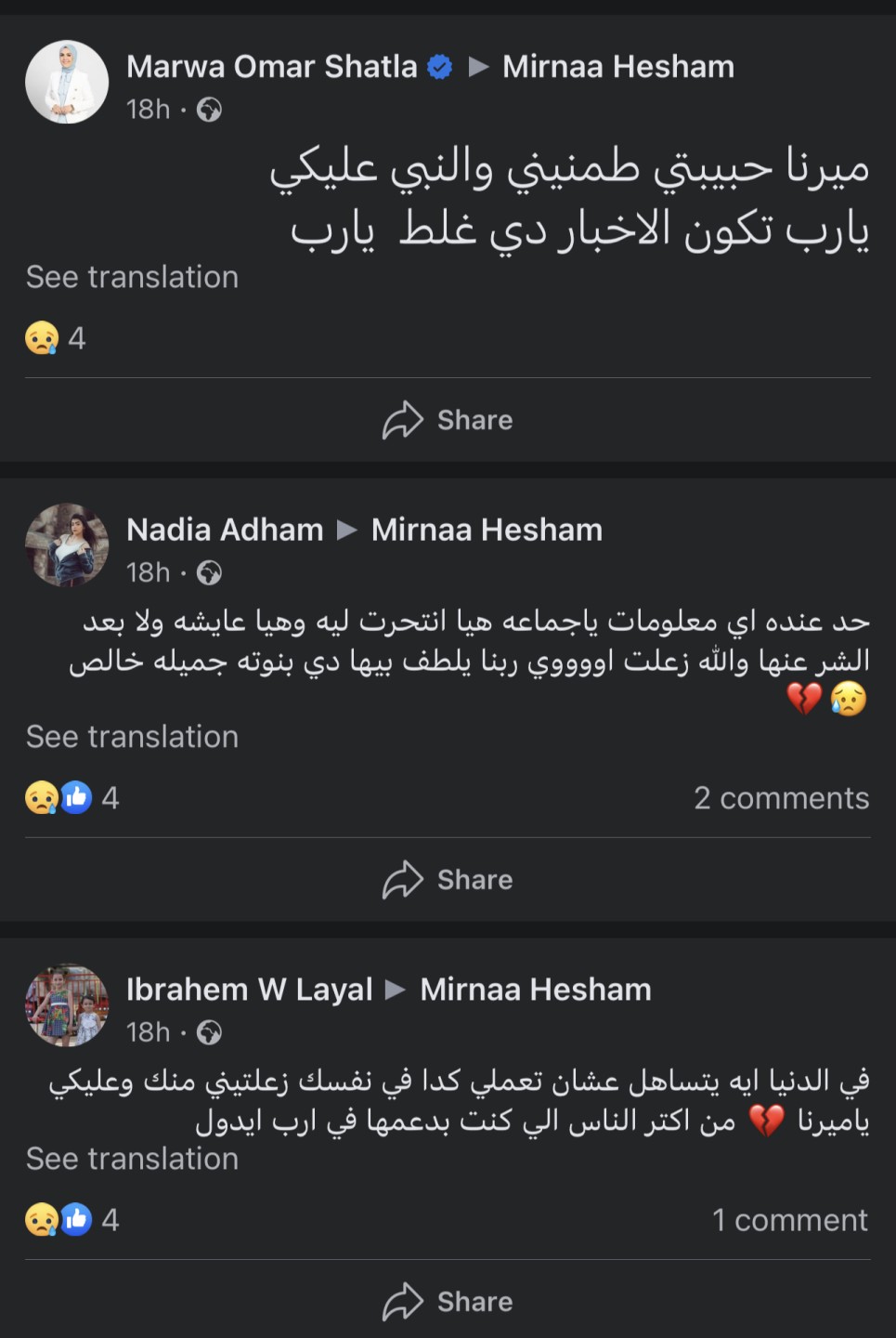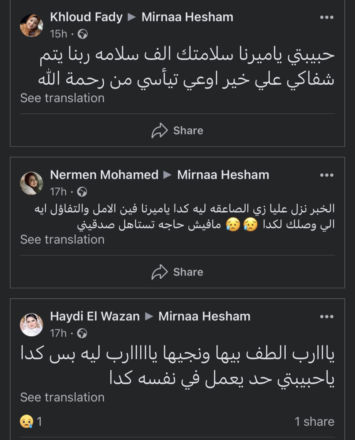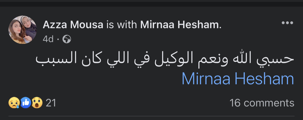 كما كتبت والدتها السيدة عزة موسى منذ أربع أيام على صفحتها الشخصية علي موقع التواصل الاجتماعي الفيسبوك: حسبي الله ونعم الوكيل في اللي كان السبب.