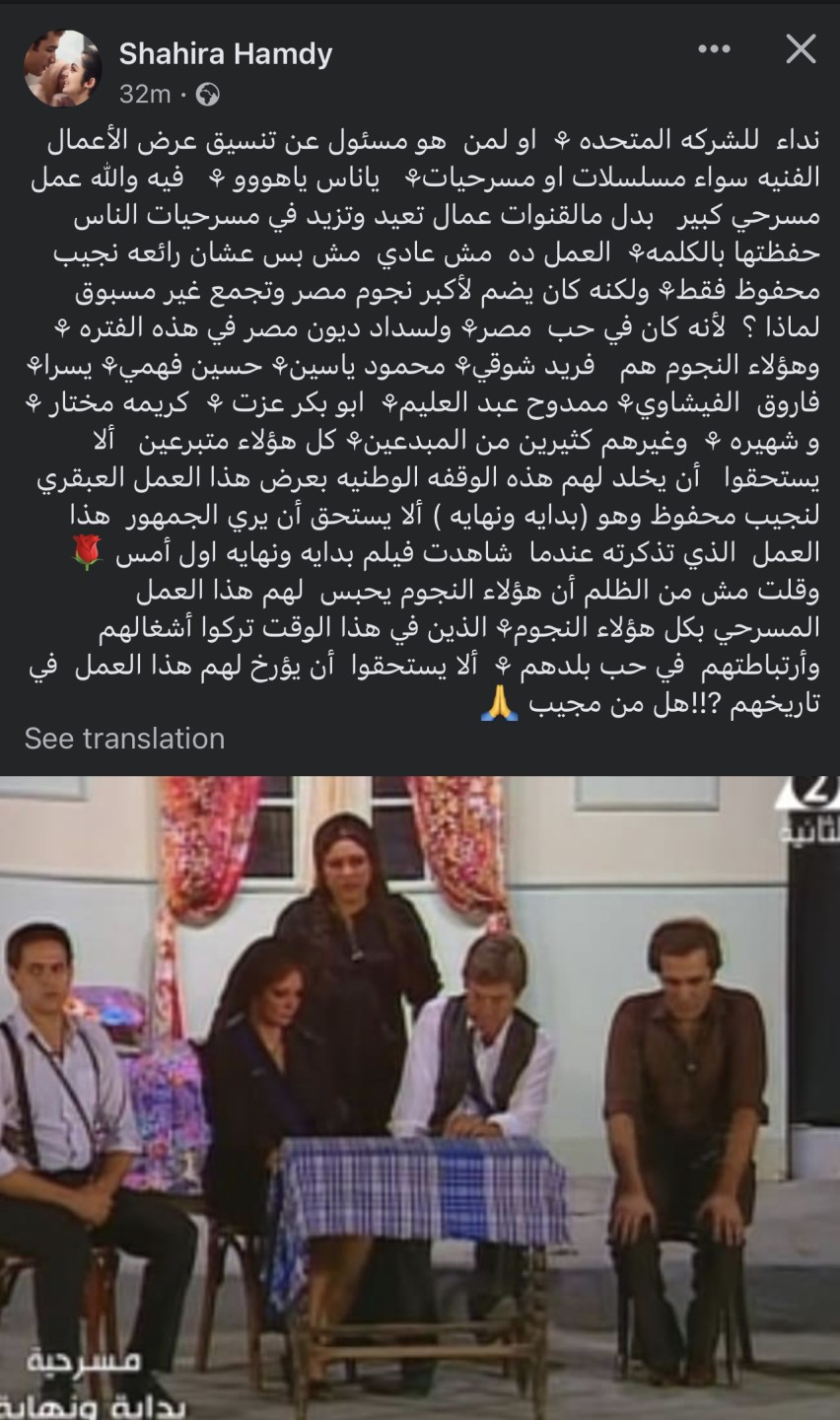 وكتبت شهيرة، من خلال حسابها الرسمى على موقع التواصل الاجتماعى "الفيسبوك": نداء للشركة المتحدة، أو لمن هو مسئول عن تنسيق عرض الأعمال الفنية سواء مسلسلات أو مسرحيات، ياناس ياهووو، فيه والله عمل مسرحى كبير بدل ما القنوات عمالة تعيد وتزيد فى مسرحيات الناس حفظتها بالكلمة.