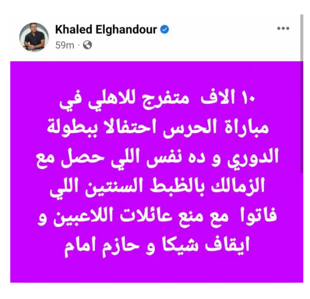 وقال الغندور عبر حسابه الشخصي على موقع التواصل الإجتماعي فيسبوك : ”١٠ الاف متفرج للأهلي في مباراة الحرس احتفالا ببطولة الدوري وده نفس اللي حصل مع الزمالك بالظبط السنتين اللي فاتوا مع منع عائلات اللاعبين وإيقاف شيكا وحازم إمام”.