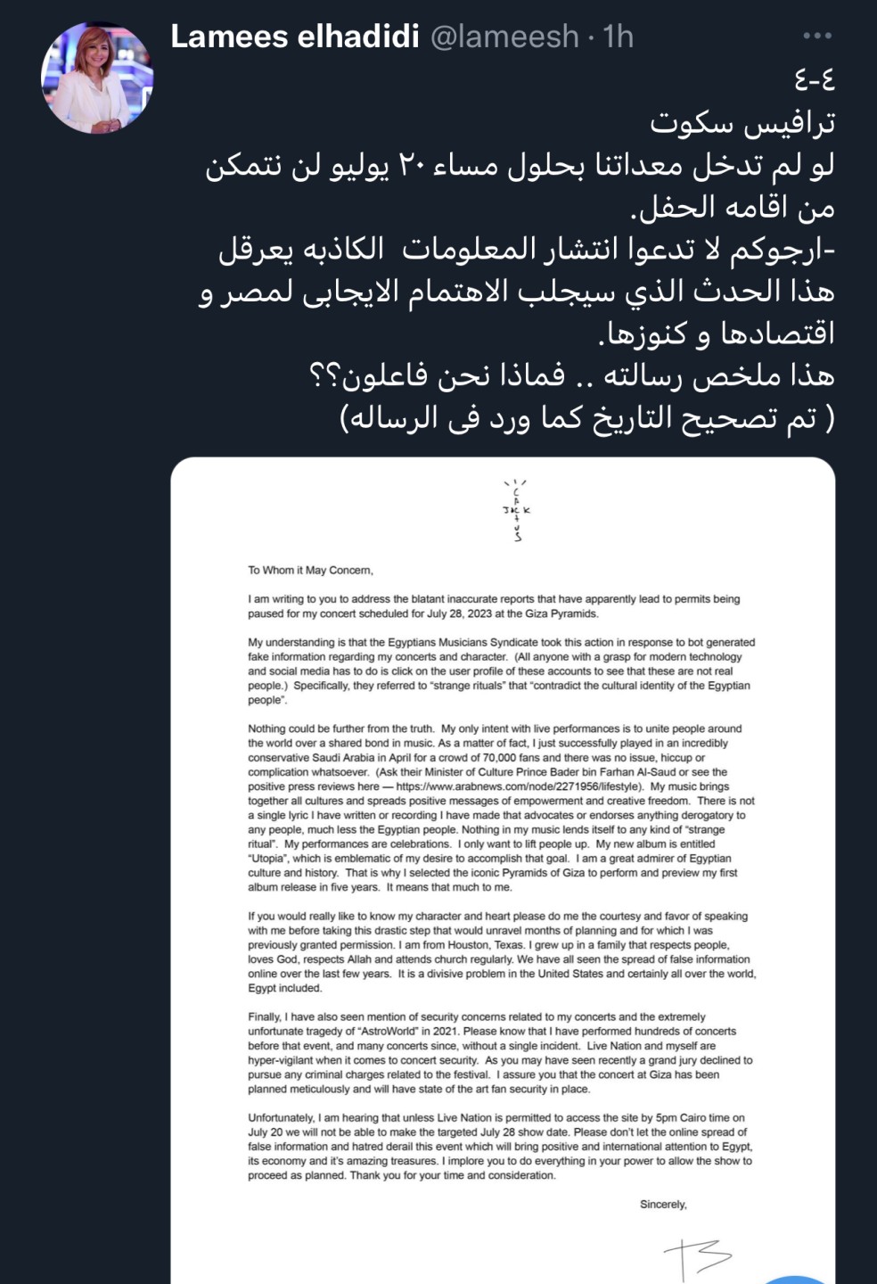ونشرت الإعلامية لميس الحديدى، من خلال حسابها الرسمى على موقع التواصل الاجتماعى تويتر، رسالة من مطرب الراب الأمريكى ترافيس سكوت.