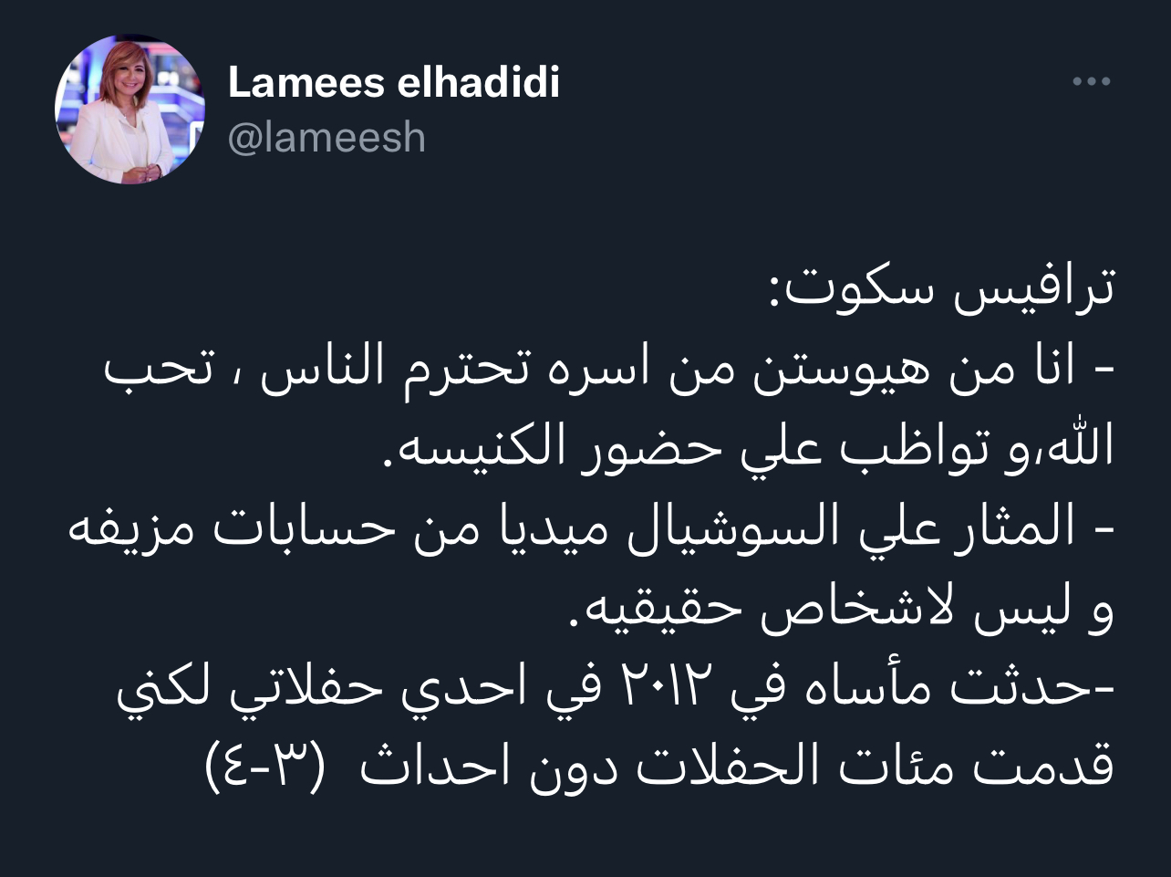 واختتم سكوت:" المثار على السوشيال ميديا من حسابات مزيفة وليس لأشخاص حقيقية، حدثت مأساة في ٢٠١٢ في إحدى حفلاتي لكني قدمت مئات الحفلات دون أحداث.