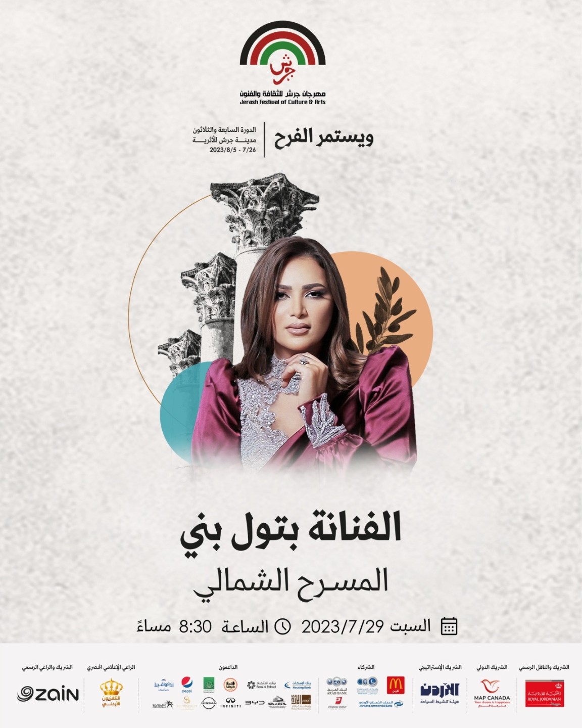ومن المقرر أن تحيي الفنانة بتول بني حفلها يوم السبت، الموافق 29 يوليو الجاري الساعة ٨:٣٠ مساءً المسرح الشمالي.
