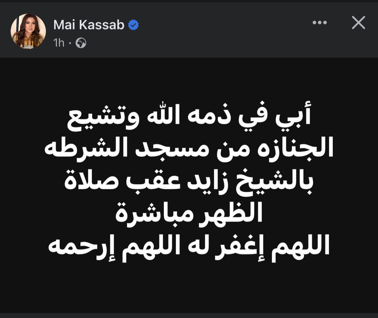 وكتب مى كساب، أبى فى ذمة الله، الجنازة من مسجد الشرطة الشيخ زايد بعد صلاة الظهر، اللهم إغفر له اللهم إرحمه.