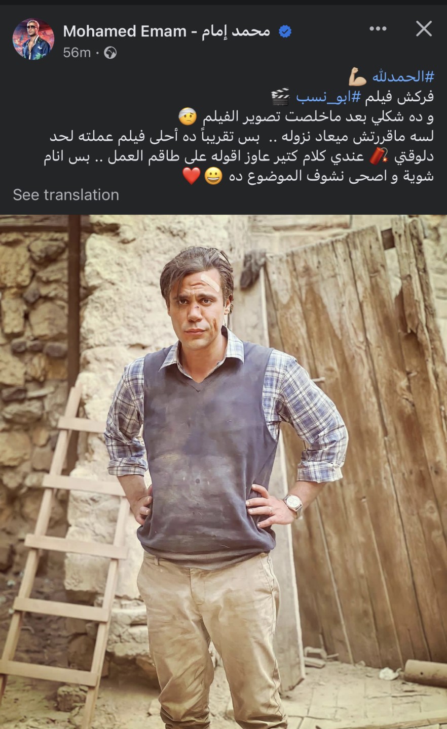 وكتب إمام، من خلال حسابه الرسمي على موقع التواصل الإجتماعى الفيسبوك: الحمدلله، فركش فيلم أبو نسب، وده شكلي بعد ماخلصت تصوير الفيلم.